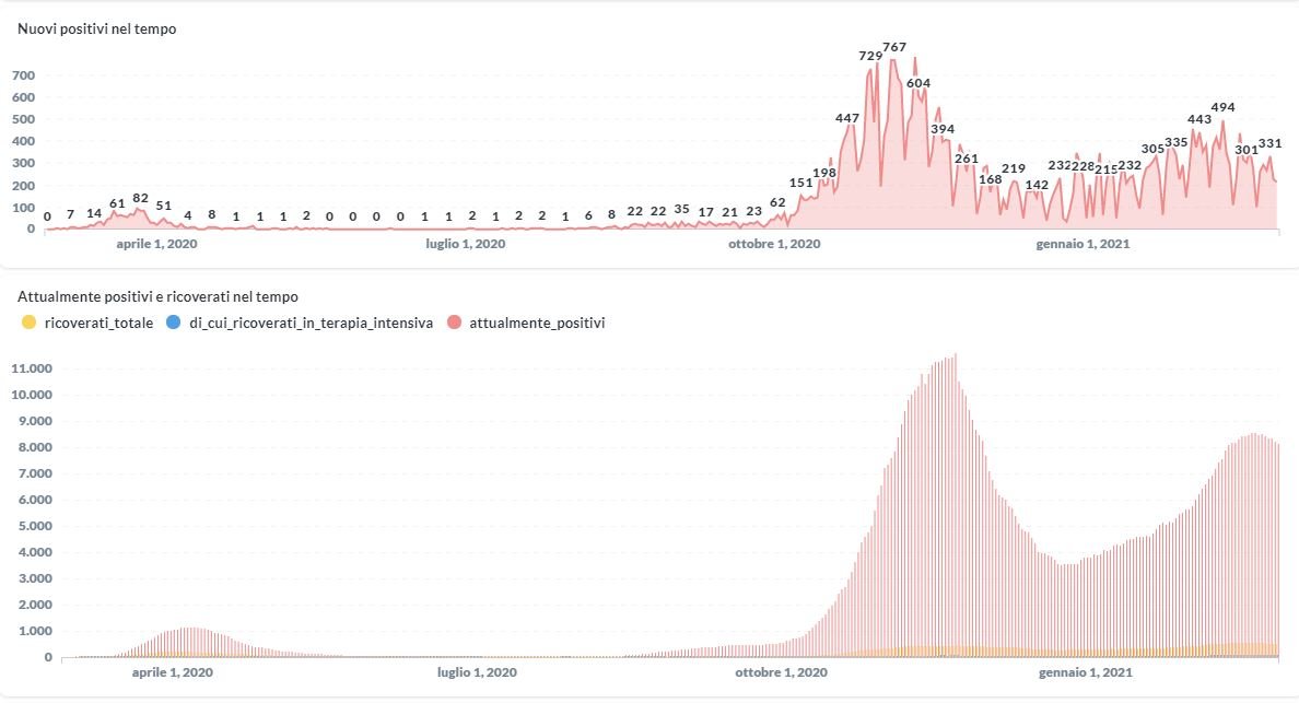 La curva degli attualmente positivi al Covid-19 in Umbria sta lentamente risalendo nelle ultime settimane, sembra in questi ultimi giorni si stia stabilizzando. Dai dati aggiornati alle ore 11:55 di oggi 28 febbraio, 44.683 persone in Umbria risultano in totale positive al virus (+212 rispetto a ieri) , gli attualmente positivi sono 8.141 (-74 rispetto a ieri), i guariti sono 35.492 (+273 rispetto a ieri).