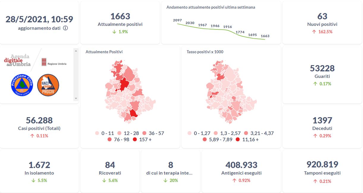 La curva degli attualmente positivi al Covid-19 in Umbria sta lentamente scendendo nelle ultime settimane. Dai dati aggiornati alle ore 10:59 di oggi 28 maggio, 56.288 persone in Umbria risultano in totale positive al virus (+ 63 rispetto a ieri) , gli attualmente positivi sono 1.663 (-33 rispetto a ieri), i guariti sono 53.228 (+91 rispetto a ieri).