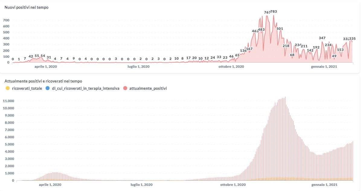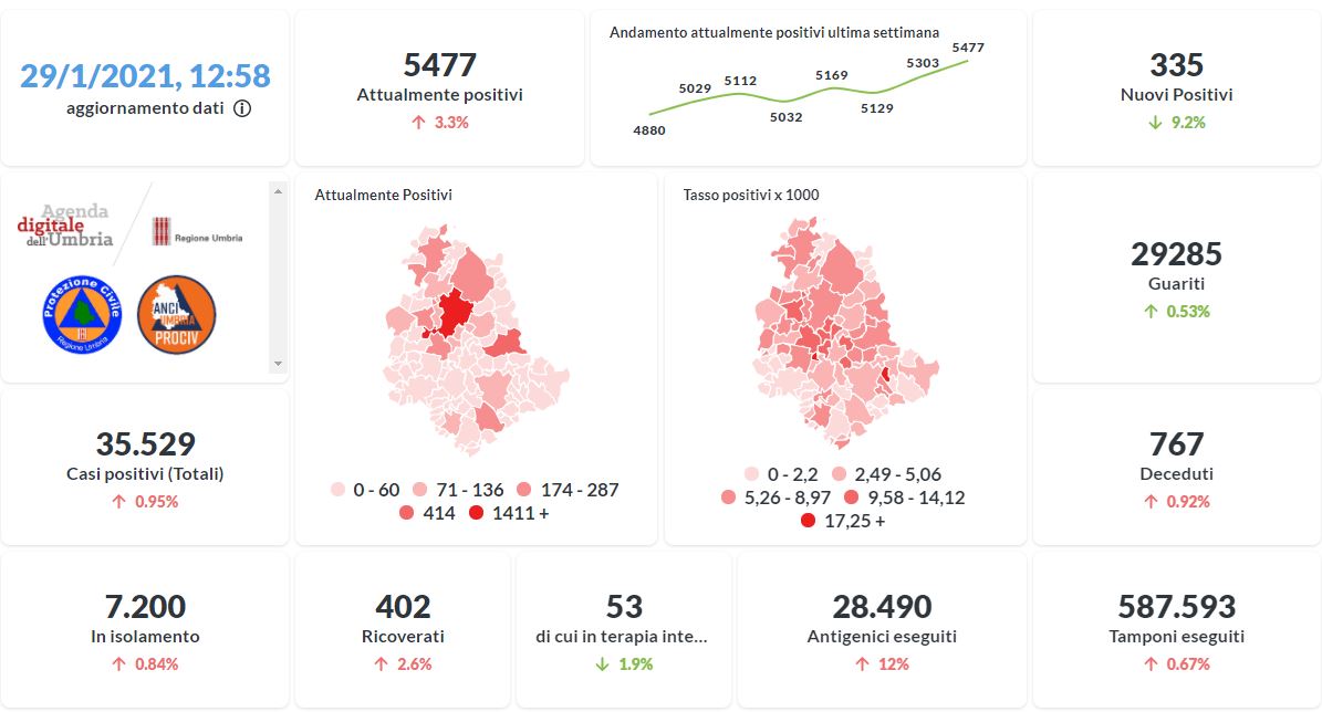 In aumento oggi il numero degli attualmente positivi al Covid-19 in Umbria. La curva sta lentamente risalendo nelle ultime settimane. Dai dati aggiornati alle ore 12:58 di oggi 29 gennaio, 35.529 persone in Umbria risultano in totale positive al virus (+335 rispetto a ieri) , gli attualmente positivi sono 5.477 (+174 rispetto a ieri), i guariti sono 29.285 (+154 rispetto a ieri).