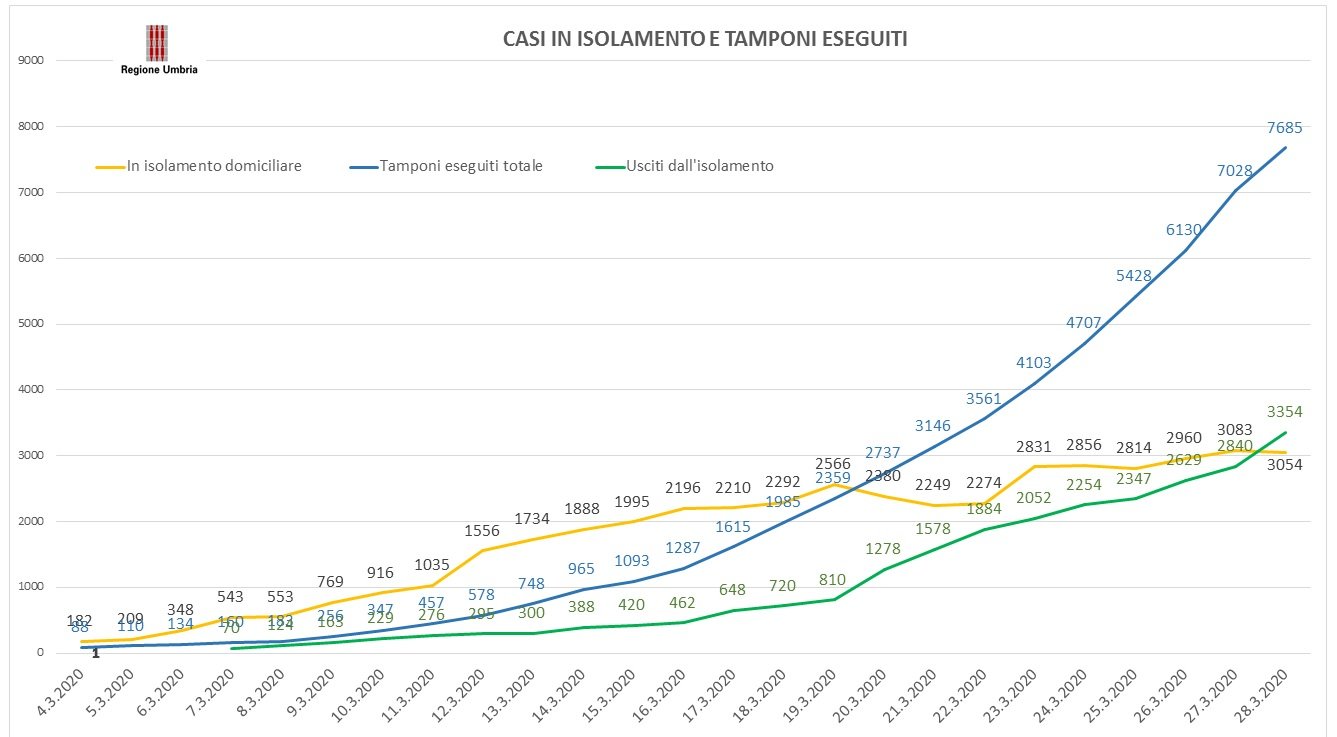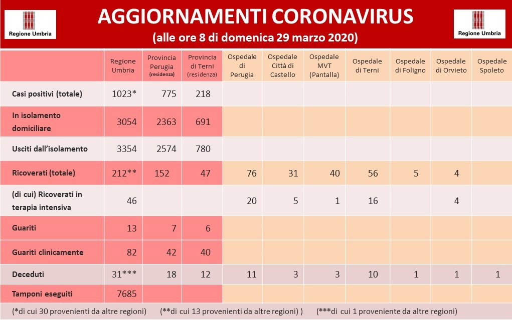 Coronavirus, i dati aggiornati al 29 marzo della Regione Umbria.