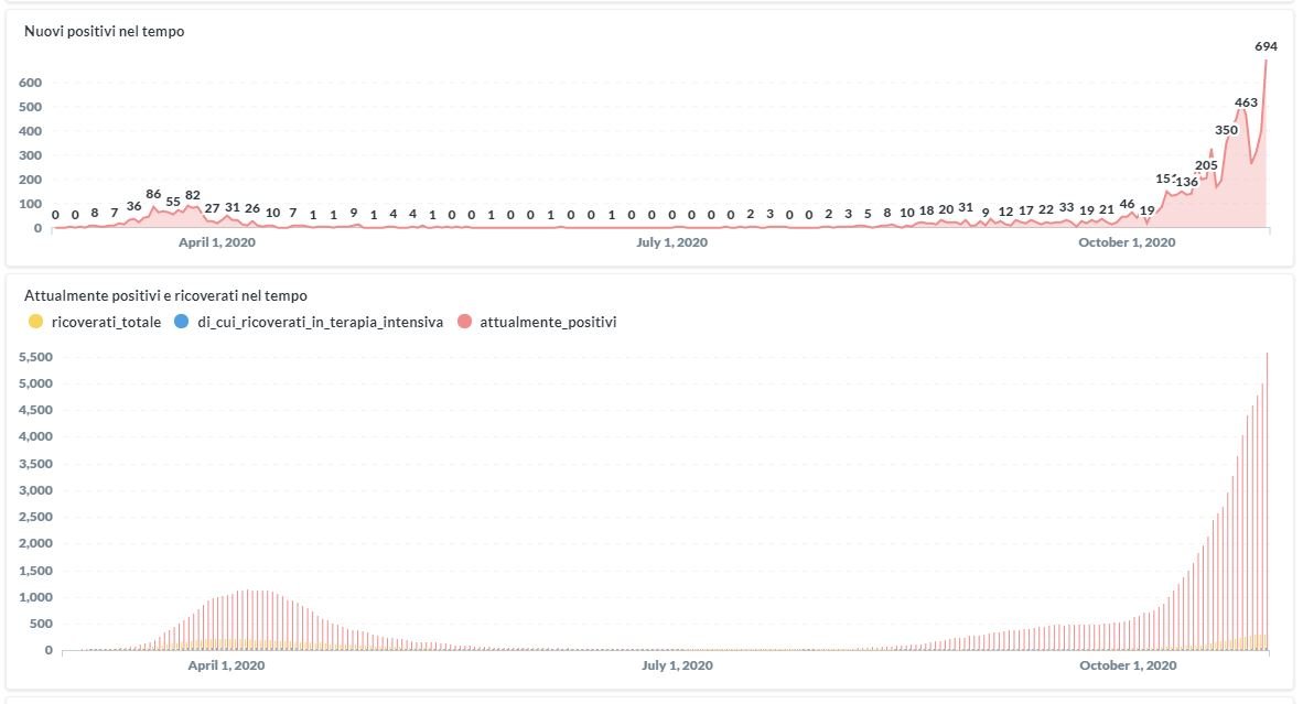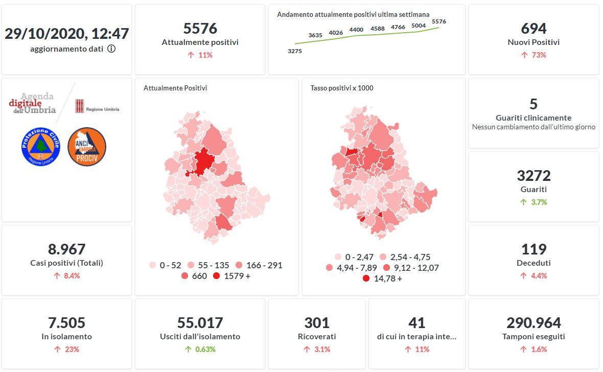 Prosegue il trend in aumento in Umbria del numero dei contagiati da Covid-19. Dai dati aggiornati alle ore 12:47 di oggi 29 ottobre, 8967 persone in Umbria risultano in totale positive al virus (+694 rispetto a ieri) , gli attualmente positivi sono 5576 (+572 rispetto a ieri), i guariti sono 3272 (+117 rispetto a ieri).