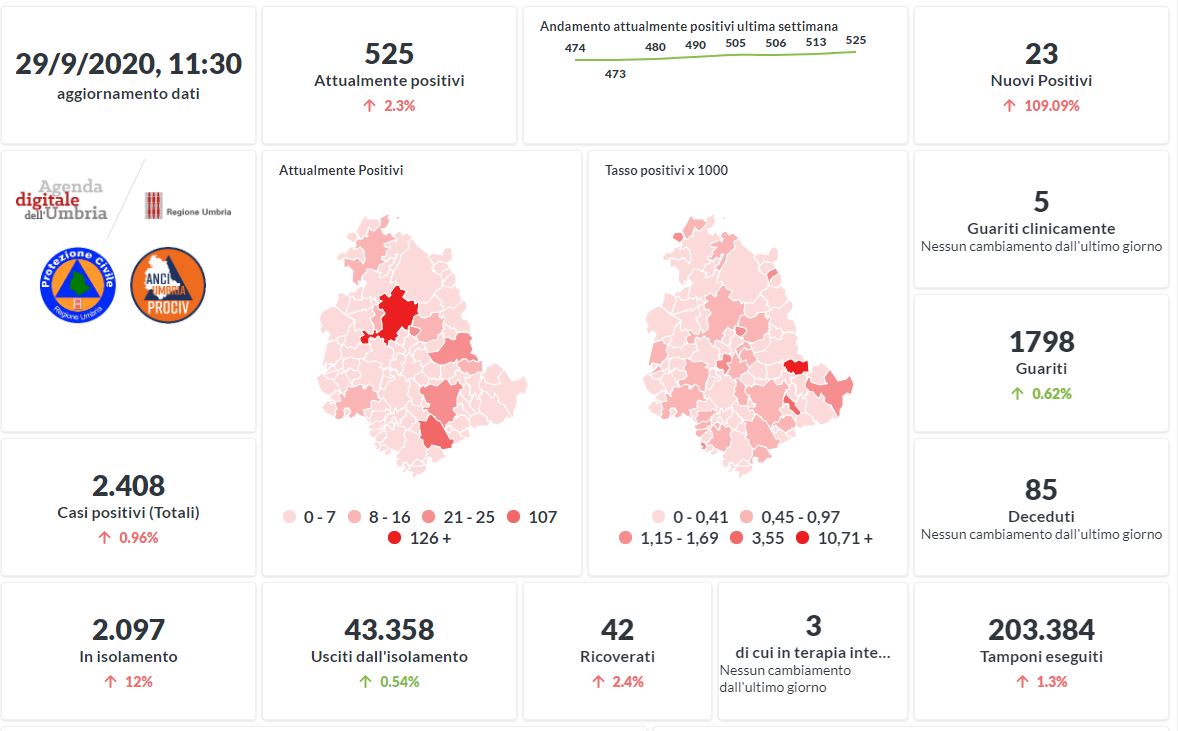 Prosegue il trend in aumento in Umbria del numero dei contagiati da Covid-19. Dai dati aggiornati alle ore 11:30 di oggi 29 settembre, 2408 persone in Umbria risultano in totale positive al virus (+23 rispetto a ieri) , gli attualmente positivi sono 525 (+12 rispetto a ieri), i guariti sono 1798 (+11 rispetto a ieri).