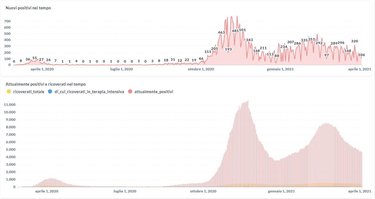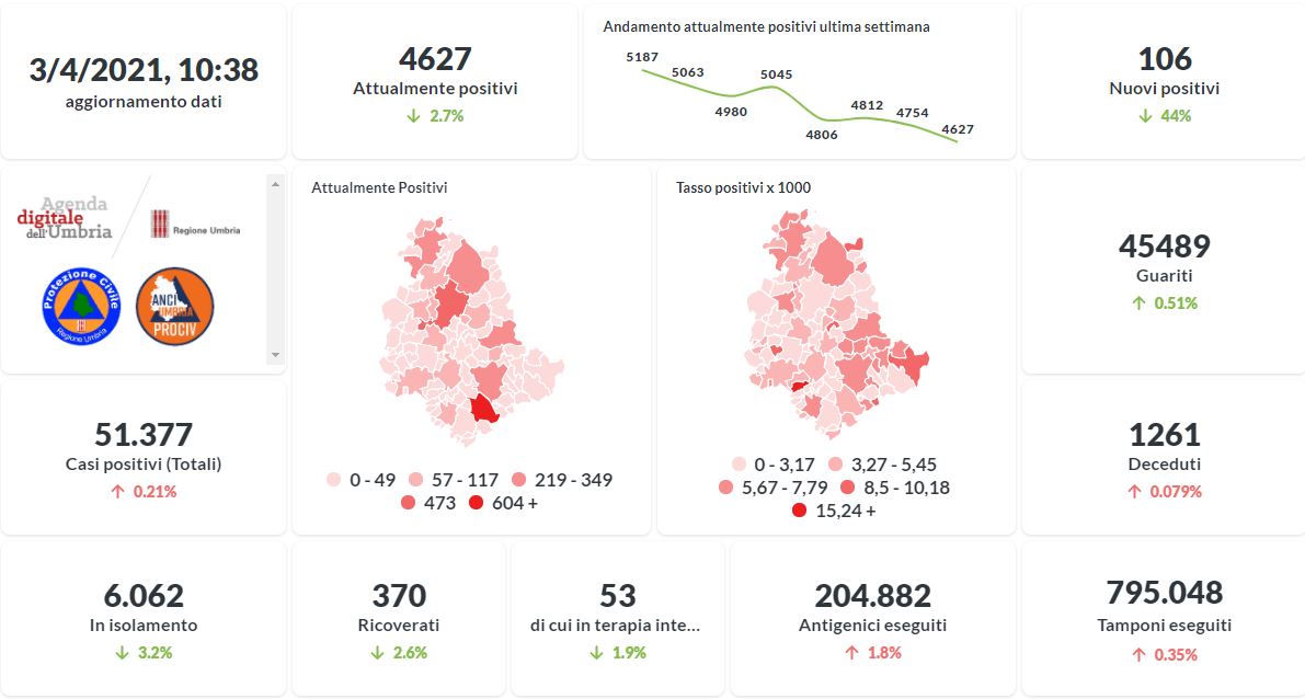 La curva degli attualmente positivi al Covid-19 in Umbria sta lentamente scendendo negli ultimi giorni. Dai dati aggiornati alle ore 10:38 di oggi 3 aprile, 51.377 persone in Umbria risultano in totale positive al virus (+ 106 rispetto a ieri) , gli attualmente positivi sono 4.627 (-127 rispetto a ieri), i guariti sono 45.489 (+232 rispetto a ieri).
