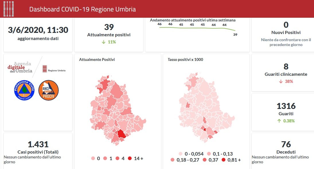 L’Umbria avvia la Fase 3 con zero contagiati da Covid-19 per l’ottavo giorno consecutivo. Dai dati aggiornati alle ore 11:30 di oggi 3 giugno, 1431 persone in Umbria risultano positive al virus (+0 rispetto a ieri), gli attualmente positivi sono 39 (-5 rispetto a ieri), i guariti sono 1316 (+5 rispetto a ieri).