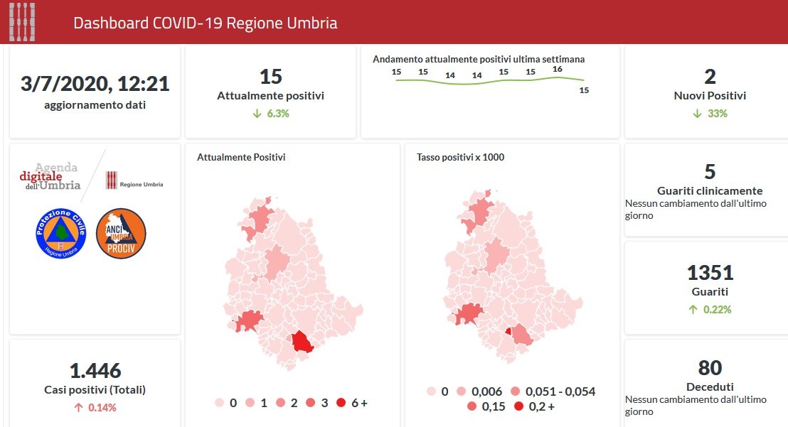 Lieve aumento in Umbria per la situazione Covid-19. Dai dati aggiornati alle ore 12:21 di oggi 03 luglio, 1446 persone in Umbria risultano in totale positive al virus (+2 rispetto a ieri), gli attualmente positivi sono 15 (-1 rispetto a ieri), i guariti sono 1351 (+2 rispetto a ieri).