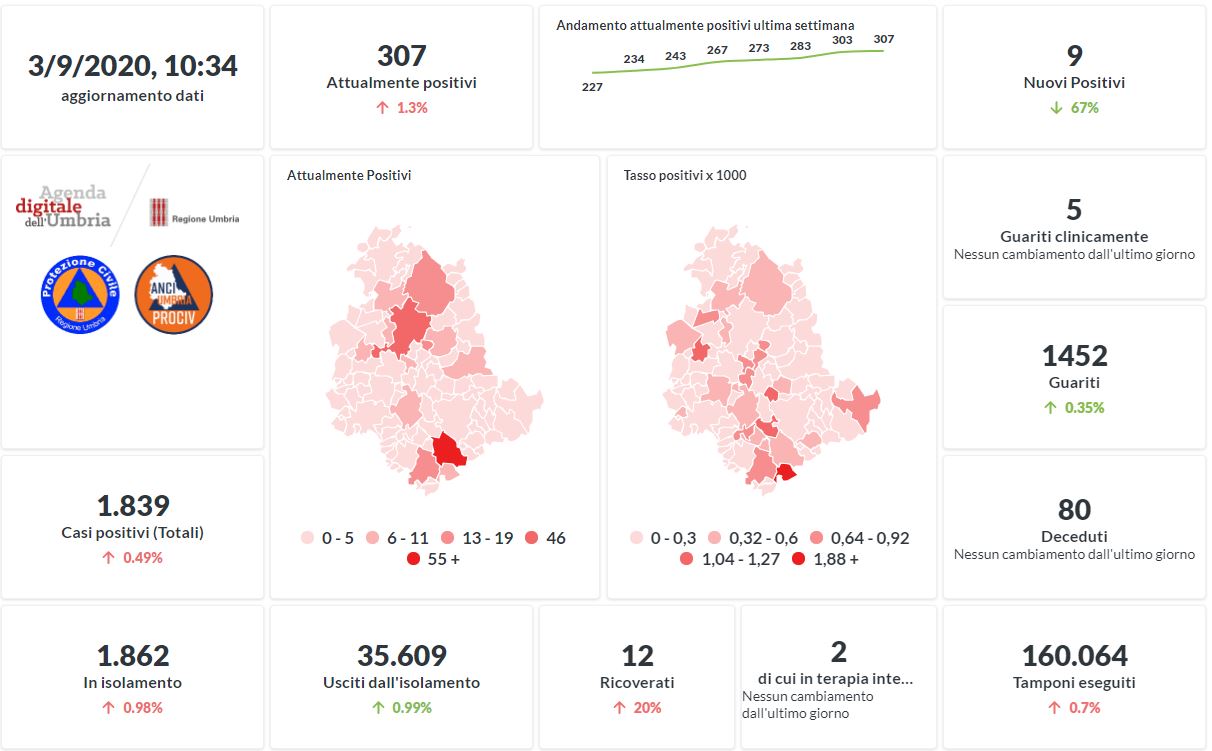 Coronavirus, i dati aggiornati al 3 settembre della Regione Umbria.