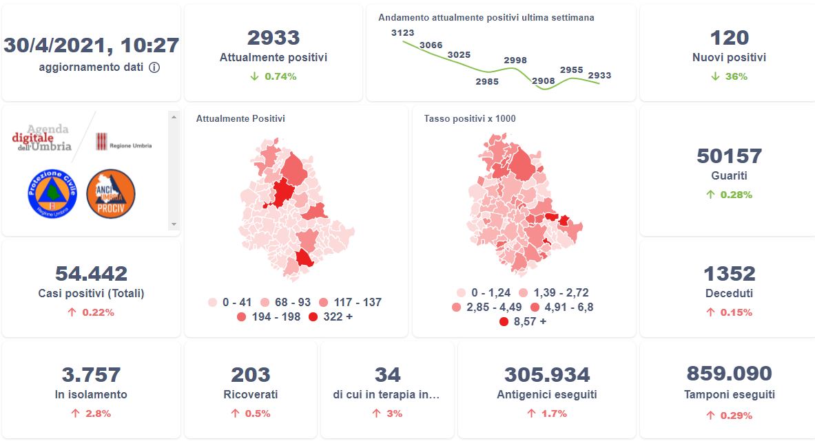 La curva degli attualmente positivi al Covid-19 in Umbria sta lentamente scendendo negli ultimi giorni. Dai dati aggiornati alle ore 10:27 di oggi 30 aprile, 54.322 persone in Umbria risultano in totale positive al virus (+ 120 rispetto a ieri) , gli attualmente positivi sono 2.933 (-22 rispetto a ieri), i guariti sono 50.157 (+140 rispetto a ieri).