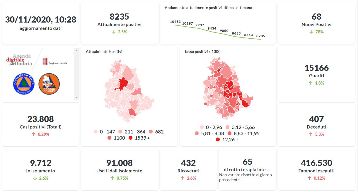 Prosegue il trend in calo in Umbria del numero degli attualmente positivi al Covid-19. Dai dati aggiornati alle ore 10:28 di oggi 30 novembre, 23.808 persone in Umbria risultano in totale positive al virus (+68 rispetto a ieri) , gli attualmente positivi sono 8.235 (-208 rispetto a ieri), i guariti sono 15.166 (+263 rispetto a ieri).