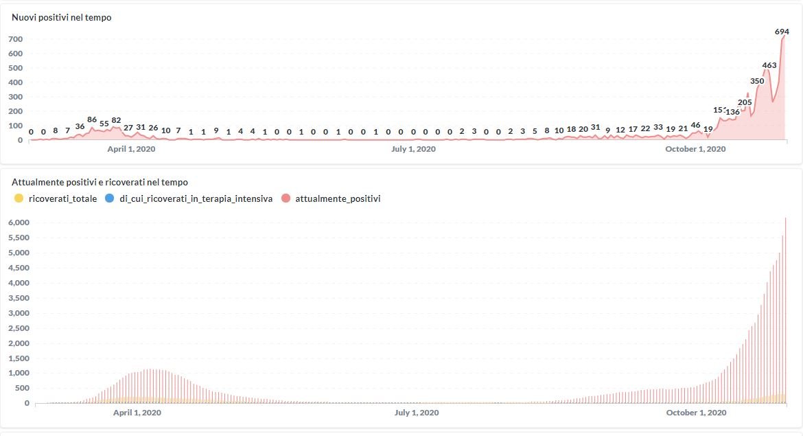 Prosegue il trend in aumento in Umbria del numero dei contagiati da Covid-19. Dai dati aggiornati alle ore 12:05 di oggi 30 ottobre, 9696 persone in Umbria risultano in totale positive al virus (+729 rispetto a ieri) , gli attualmente positivi sono 6171 (+595 rispetto a ieri), i guariti sono 3404 (+132 rispetto a ieri).