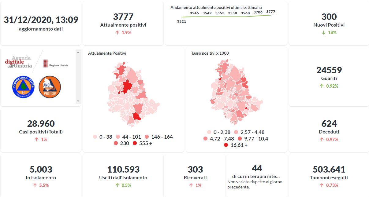 Aumenta il numero degli attualmente positivi al Covid-19 in Umbria . Dai dati aggiornati alle ore 13:09 di oggi 31 dicembre, 28.960 persone in Umbria risultano in totale positive al virus (+300 rispetto a ieri) , gli attualmente positivi sono 3.777 (+71 rispetto a ieri), i guariti sono 24.559 (+223 rispetto a ieri).