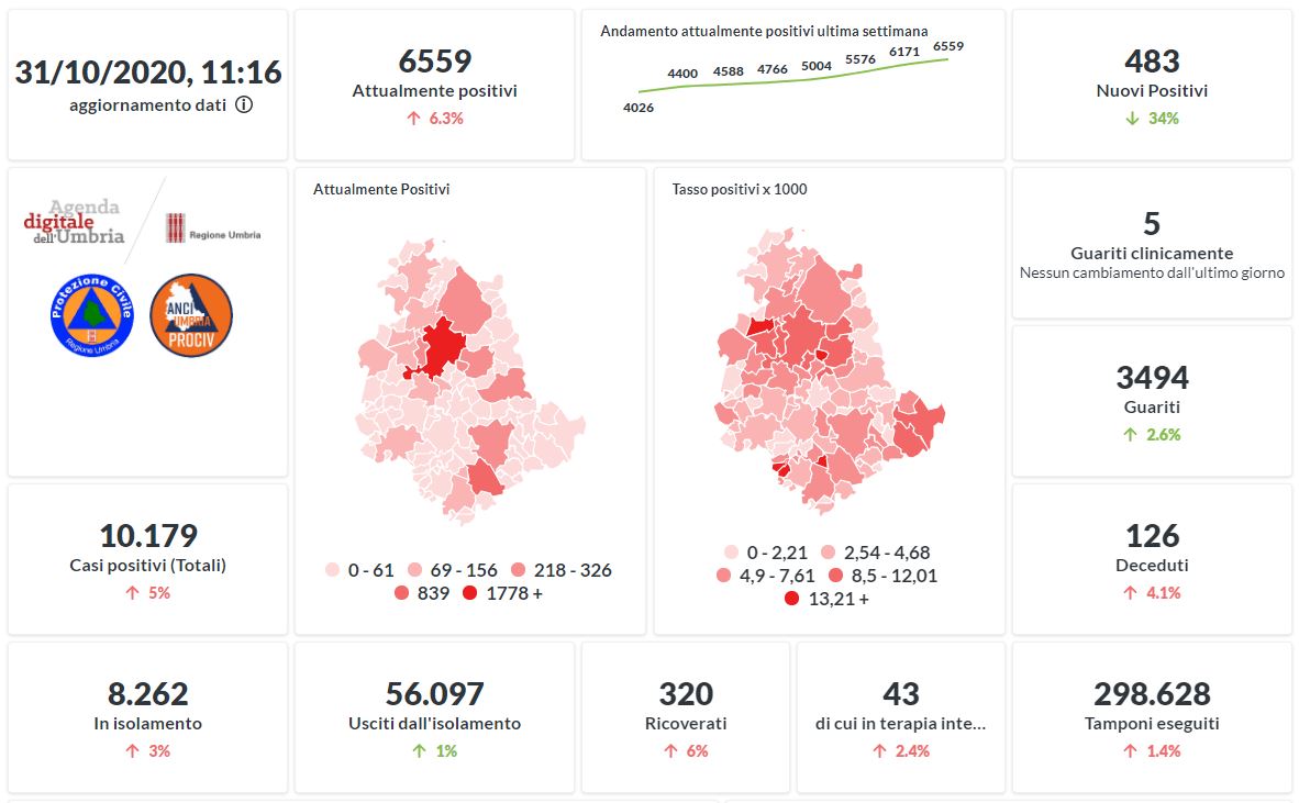 Prosegue il trend in aumento in Umbria del numero dei contagiati da Covid-19. Dai dati aggiornati alle ore 11:16 di oggi 31 ottobre, 10.179 persone in Umbria risultano in totale positive al virus (+483 rispetto a ieri) , gli attualmente positivi sono 6559 (+388 rispetto a ieri), i guariti sono 3494 (+80 rispetto a ieri).