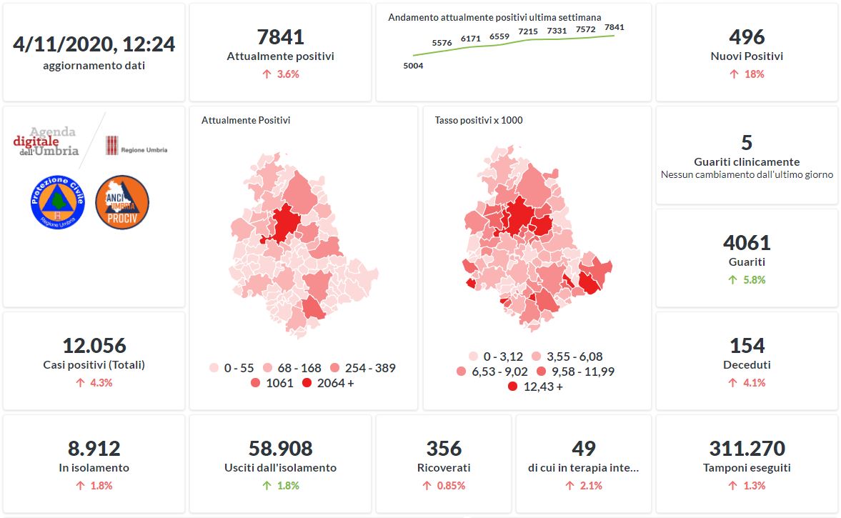 Prosegue il trend in aumento in Umbria del numero dei contagiati da Covid-19. Dai dati aggiornati alle ore 12:24 di oggi 4 novembre, 12.056 persone in Umbria risultano in totale positive al virus (+496 rispetto a ieri) , gli attualmente positivi sono 7841 (+269 rispetto a ieri), i guariti sono 4061 (+221 rispetto a ieri).