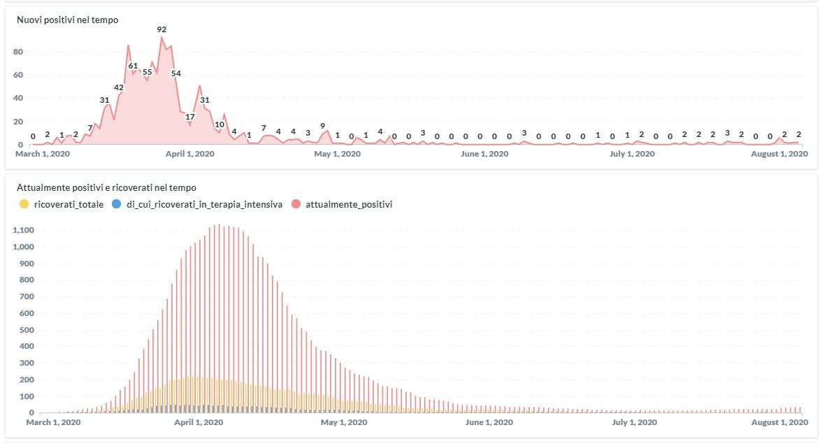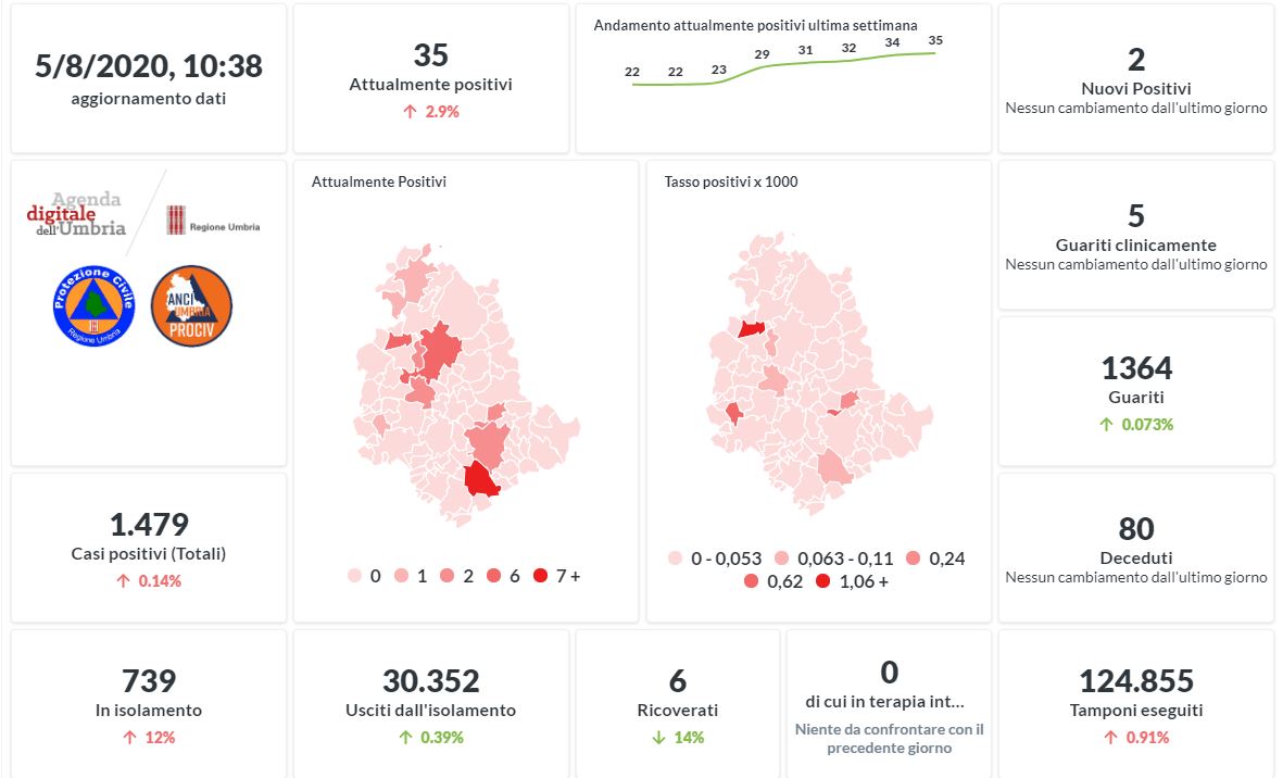 In lieve aumento in Umbria da Covid-19 il numero dei contagiati in questi primi giorni del mese di agosto. Dai dati aggiornati alle ore 10:38 di oggi 5 agosto, 1479 persone in Umbria risultano in totale positive al virus (+2 rispetto a ieri), gli attualmente positivi sono 35 (+1 rispetto a ieri), i guariti sono 1364 (+1 rispetto a ieri).