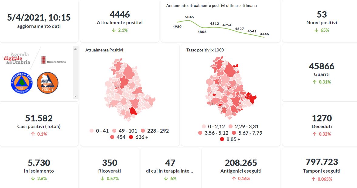 La curva degli attualmente positivi al Covid-19 in Umbria sta lentamente scendendo negli ultimi giorni. Dai dati aggiornati alle ore 10:15 di oggi 5 aprile, 51.582 persone in Umbria risultano in totale positive al virus (+ 53 rispetto a ieri) , gli attualmente positivi sono 4.446 (-95 rispetto a ieri), i guariti sono 45.866 (+144 rispetto a ieri).