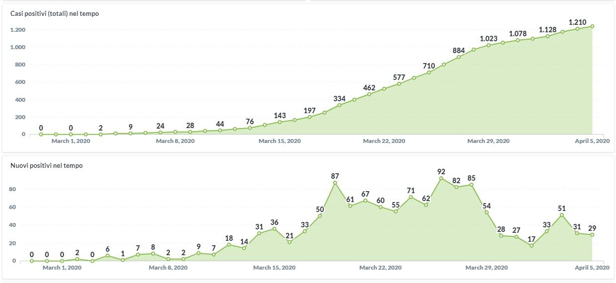 Dai dati aggiornati alle ore 12:45 di oggi 5 aprile, 1239 persone in Umbria risultano positive al virus Covid-19 (+29 rispetto a ieri, secondo ultimo dato registrato), i guariti sono 56 (+15 rispetto a ieri).