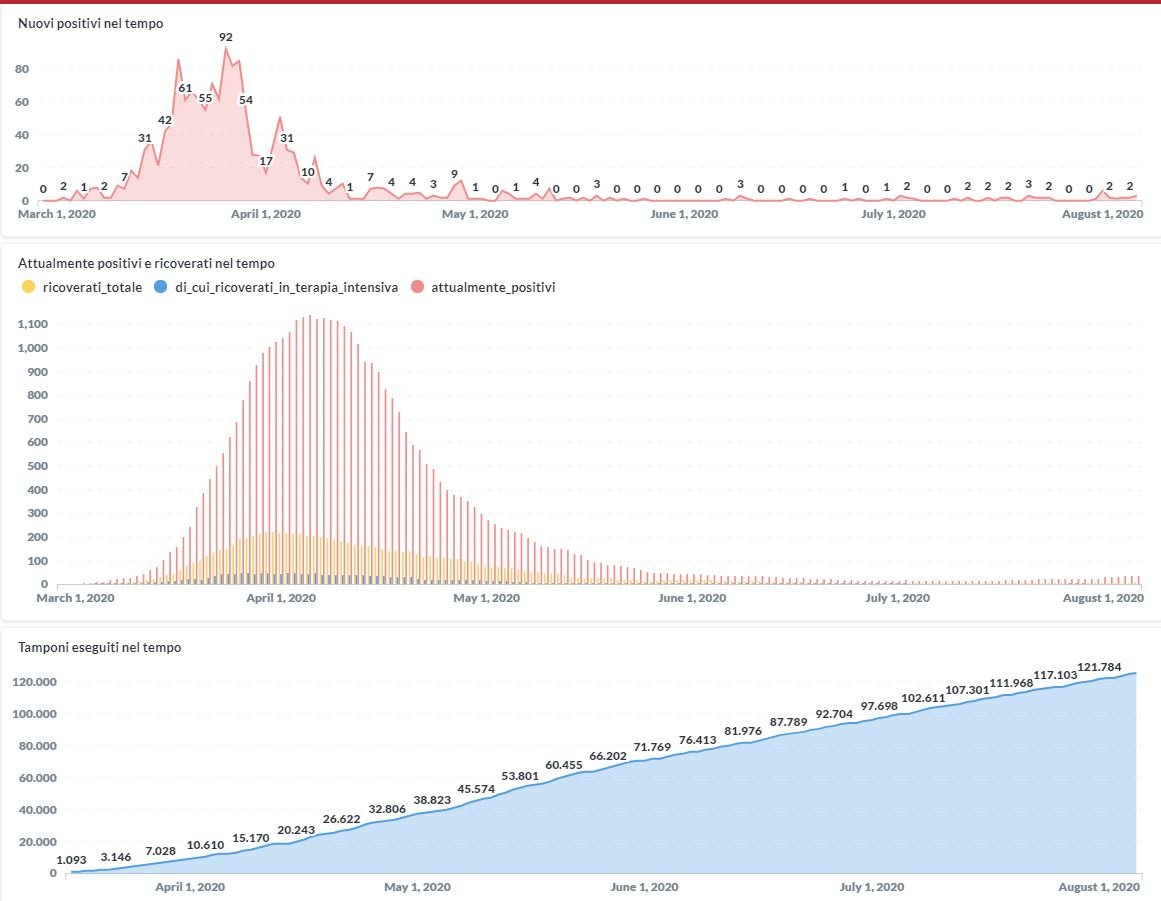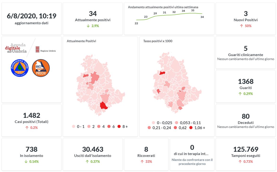 In lieve aumento in Umbria da Covid-19 il numero dei contagiati in questi primi giorni del mese di agosto. Dai dati aggiornati alle ore 10:19 di oggi 6 agosto, 1482 persone in Umbria risultano in totale positive al virus (+3 rispetto a ieri), gli attualmente positivi sono 34 (-1 rispetto a ieri), i guariti sono 1368 (+4 rispetto a ieri).
