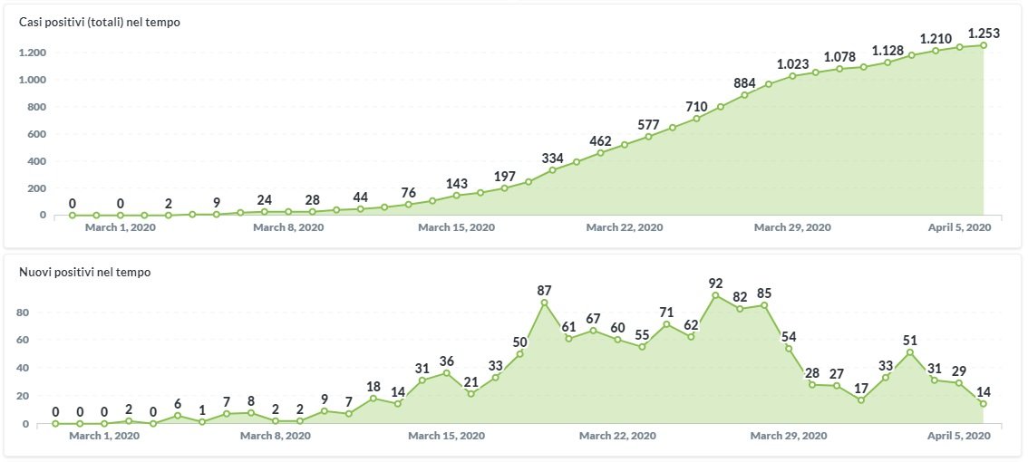 Dai dati aggiornati alle ore 13:22 di oggi 6 aprile, 1253 persone in Umbria risultano positive al virus Covid-19 (solo +14 rispetto a ieri, il dato più basso registrato nelle ultime settimane), i guariti sono 56 (+15 rispetto a ieri).