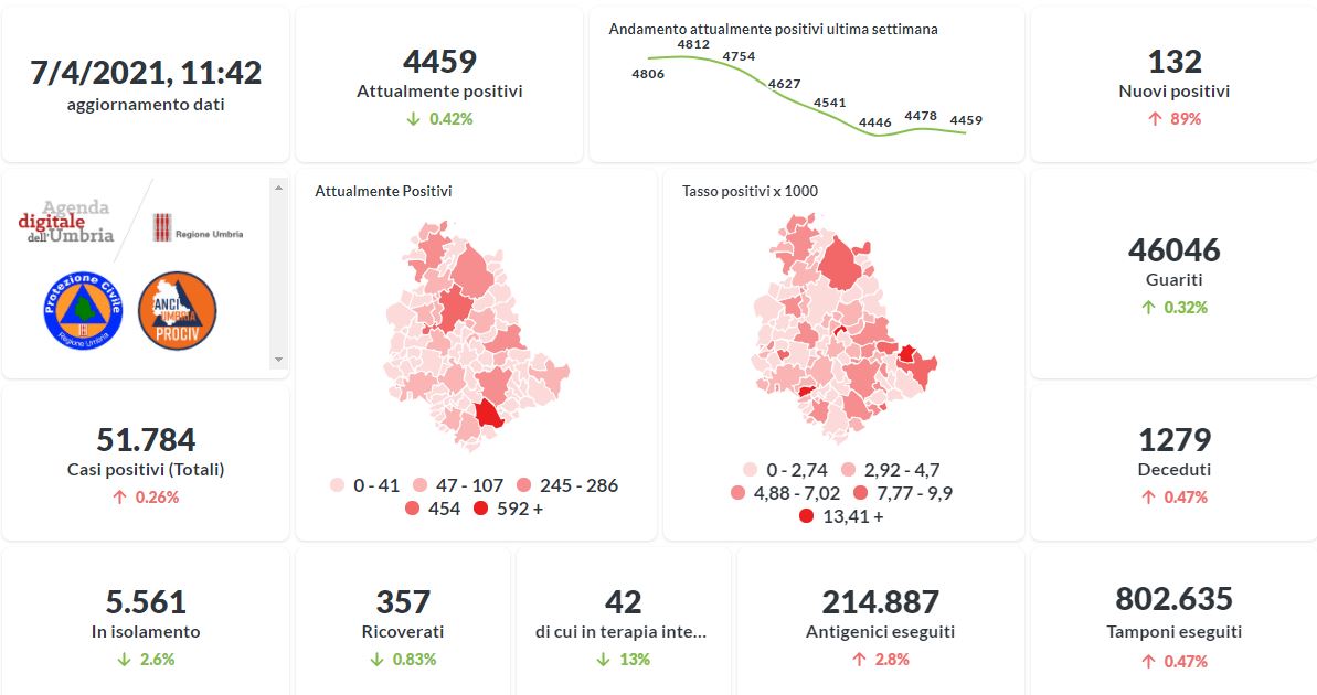La curva degli attualmente positivi al Covid-19 in Umbria sta lentamente scendendo negli ultimi giorni. Dai dati aggiornati alle ore 11:42 di oggi 7 aprile, 51.784 persone in Umbria risultano in totale positive al virus (+ 132 rispetto a ieri) , gli attualmente positivi sono 4.459 (-19 rispetto a ieri), i guariti sono 46.046 (+145 rispetto a ieri).