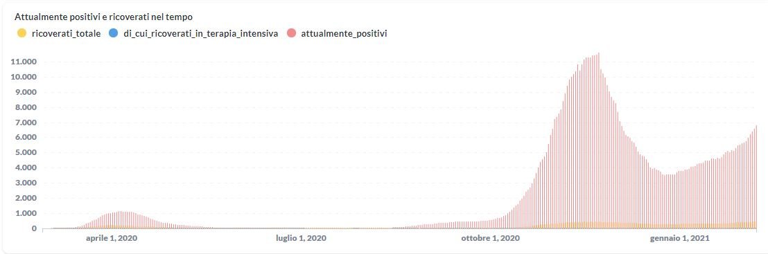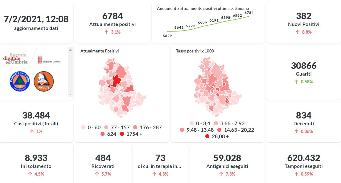 La curva degli attualmente positivi al Covid-19 in Umbria sta lentamente risalendo nelle ultime settimane. Dai dati aggiornati alle ore 12:08 di oggi 7 febbraio, 38.484 persone in Umbria risultano in totale positive al virus (+382 rispetto a ieri) , gli attualmente positivi sono 6.784 (+202 rispetto a ieri), i guariti sono 30.866 (+177 rispetto a ieri).