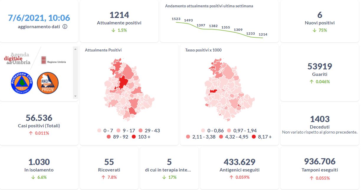 La curva degli attualmente positivi al Covid-19 in Umbria sta lentamente scendendo nelle ultime settimane. Dai dati aggiornati alle ore 10:06 di oggi 7 giugno, 56.536 persone in Umbria risultano in totale positive al virus (+ 6 rispetto a ieri) , gli attualmente positivi sono 1.214 (-19 rispetto a ieri), i guariti sono 53.919 (+25 rispetto a ieri).