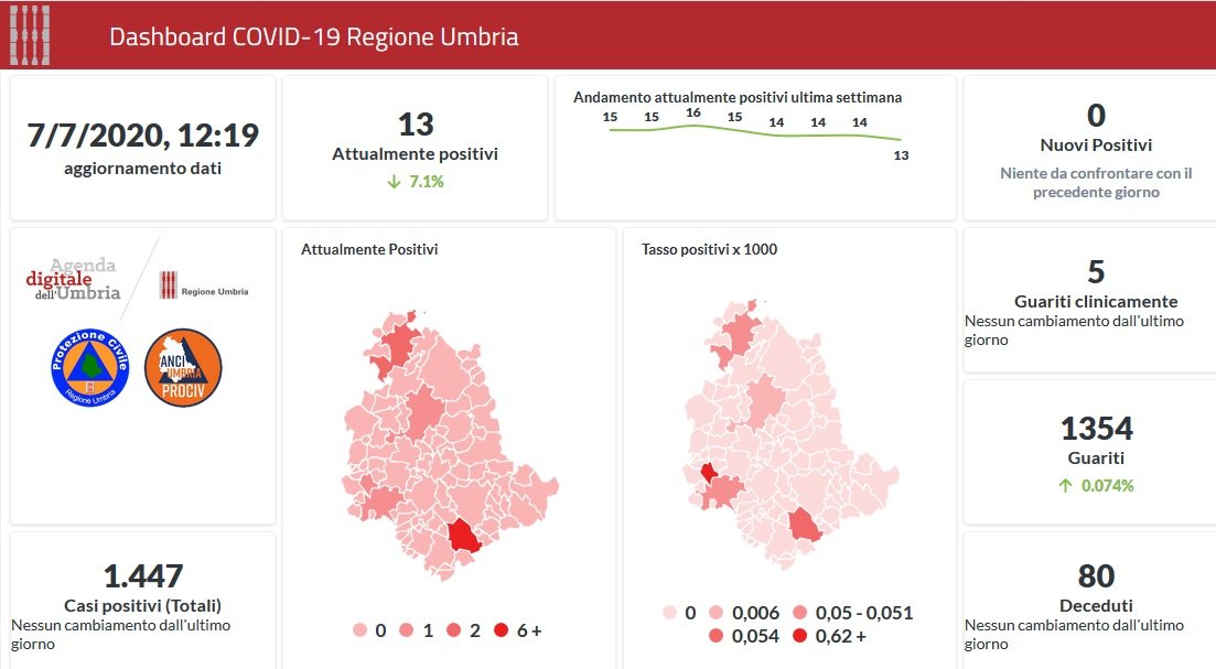 Situazione sempre stabile in Umbria per la situazione Covid-19. Dai dati aggiornati alle ore 12:19 di oggi 7 luglio, 1447 persone in Umbria risultano in totale positive al virus (+0 rispetto a ieri), gli attualmente positivi sono 13 (-1 rispetto a ieri), i guariti sono 1354 (+1 rispetto a ieri).