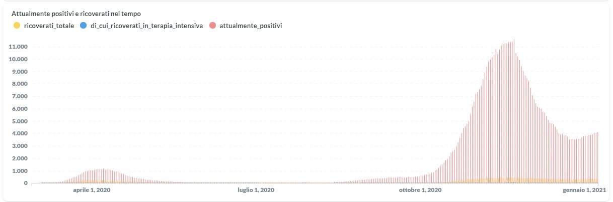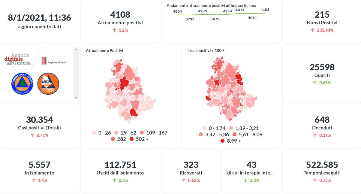 In aumento oggi il numero degli attualmente positivi al Covid-19 in Umbria. La  curva sta lentamente risalendo nelle ultime settimane. Dai dati aggiornati alle ore 11:36 di oggi 8 gennaio, 30.354 persone in Umbria risultano in totale positive al virus (+215 rispetto a ieri) , gli attualmente positivi sono 4.108 (+47 rispetto a ieri), i guariti sono 25.598 (+166 rispetto a ieri).
