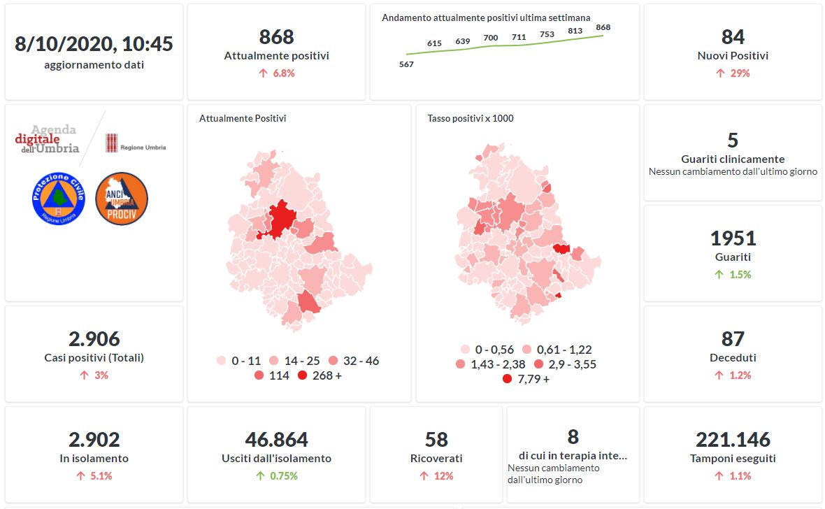 Prosegue il trend in aumento in Umbria del numero dei contagiati da Covid-19. Dai dati aggiornati alle ore 10:45 di oggi 8 ottobre, 2906 persone in Umbria risultano in totale positive al virus (+84 rispetto a ieri) , gli attualmente positivi sono 868 (+55 rispetto a ieri), i guariti sono 1951 (+28 rispetto a ieri).