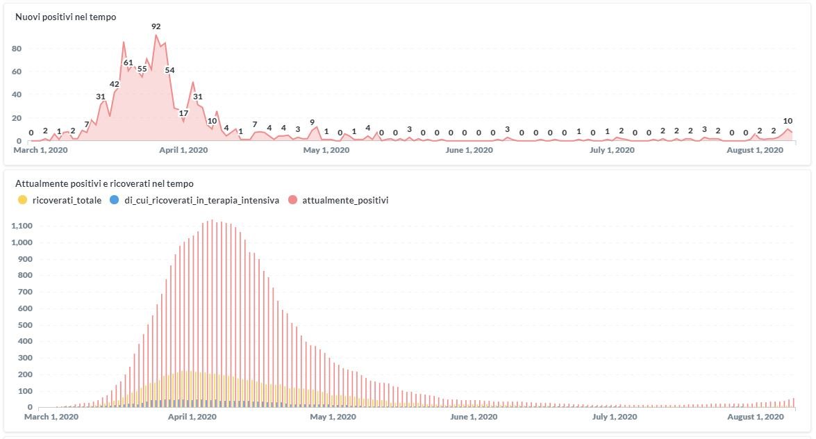 In aumento in Umbria da Covid-19 il numero dei contagiati in questi primi giorni del mese di agosto. Dai dati aggiornati alle ore 12:48 di oggi 8 agosto, 1505 persone in Umbria risultano in totale positive al virus (+7 rispetto a ieri), gli attualmente positivi sono 54, i guariti sono 1371 (uguale rispetto a ieri).