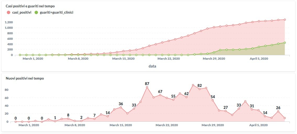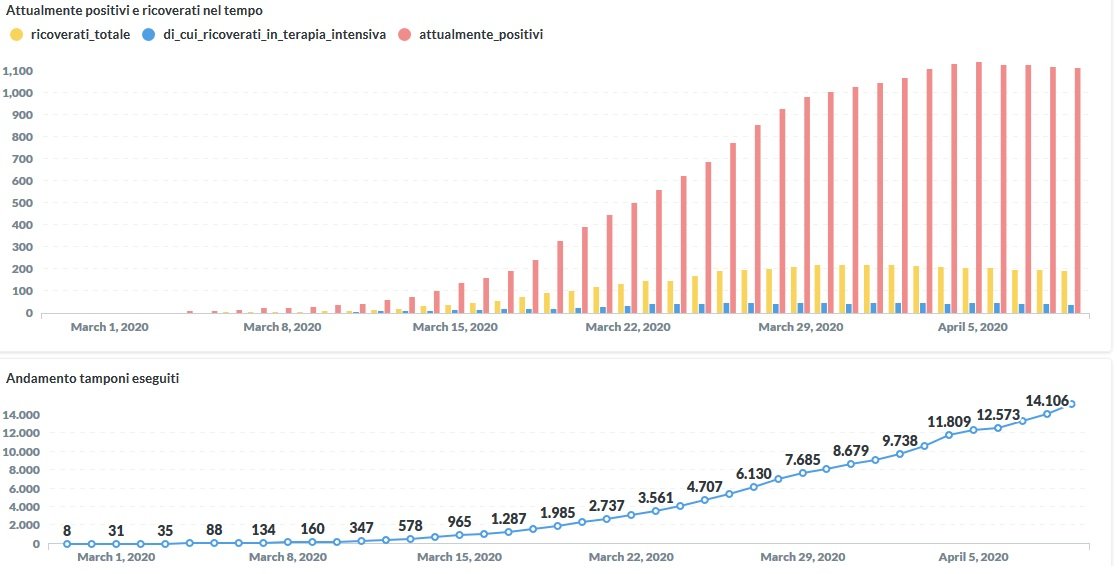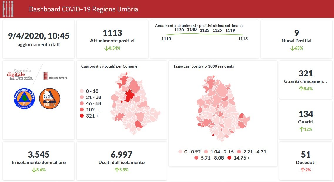 Il miglior dato di sempre per i positivi di Covid-19 in Umbria. Dai dati aggiornati alle ore 10:45 di oggi 9 aprile, 1298 persone in Umbria risultano positive al virus (solo +9 rispetto a ieri), i guariti sono 134 (+14 rispetto a ieri).
