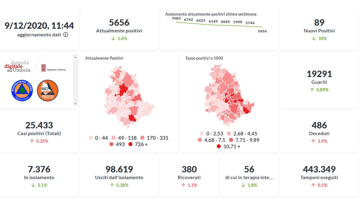 Prosegue il trend in calo in Umbria del numero degli attualmente positivi al Covid-19. Dai dati aggiornati alle ore 11:44 di oggi 9 dicembre, 25.433 persone in Umbria risultano in totale positive al virus (+89 rispetto a ieri) , gli attualmente positivi sono 5.656 (-90 rispetto a ieri), i guariti sono 19.291 (+170 rispetto a ieri).