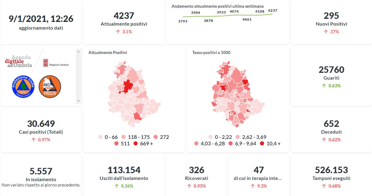 In aumento oggi il numero degli attualmente positivi al Covid-19 in Umbria. La curva sta lentamente risalendo nelle ultime settimane. Dai dati aggiornati alle ore 12:26 di oggi 9 gennaio, 30.649 persone in Umbria risultano in totale positive al virus (+295 rispetto a ieri) , gli attualmente positivi sono 4.237 (+129 rispetto a ieri), i guariti sono 25.760 (+162 rispetto a ieri).