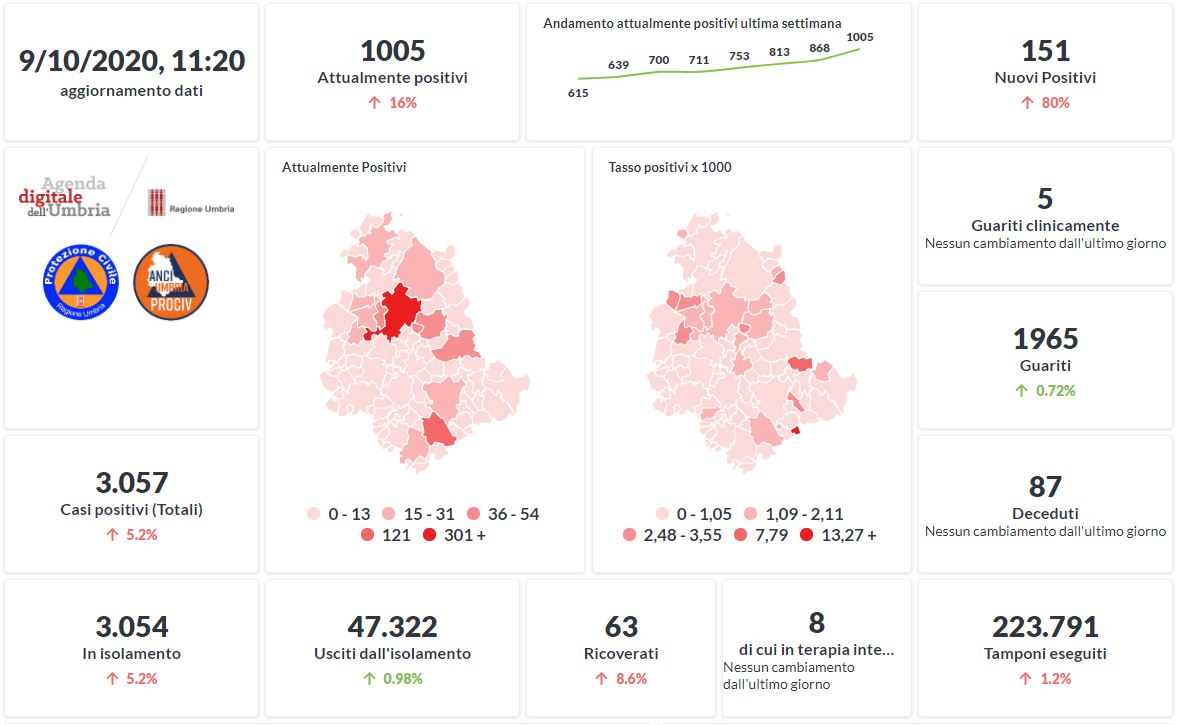 Prosegue il trend in aumento in Umbria del numero dei contagiati da Covid-19. Dai dati aggiornati alle ore 11:20 di oggi 9 ottobre, 3057 persone in Umbria risultano in totale positive al virus (+151 rispetto a ieri) , gli attualmente positivi sono 1005 (+137 rispetto a ieri), i guariti sono 1965 (+14rispetto a ieri).