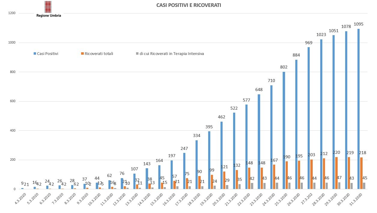 Per il terzo giorno nella Regione Umbria il trend dei contagi continua ad essere stabile, con una curva in flessione: sono 1095 i pazienti risultati positivi (oggi solo +17 casi rispetto a ieri). Salgono a 45 i pazienti in terapia intensiva. Sono dislocati negli ospedali di Perugia, Terni, Città di Castello e Orvieto, secondo i dati emanati dalla Regione Umbria e aggiornati come sempre nella mattinata di oggi.