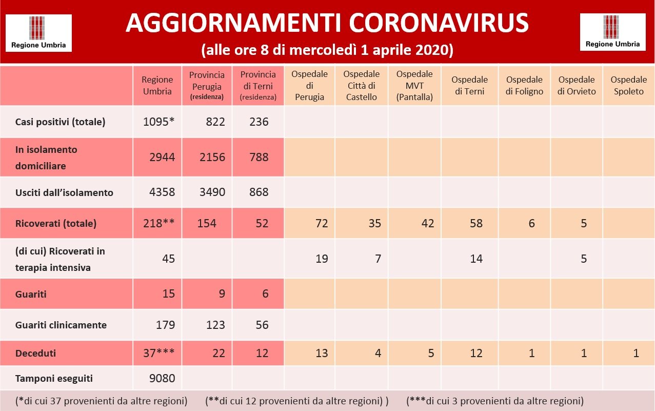 I guariti clinicamente salgono a 178 pazienti, 123 nella provincia di Perugia e 56 in quella di Terni.