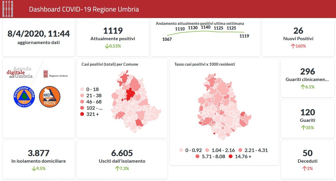Lieve aumento dei positivi di Covid-19 in Umbria. Dai dati aggiornati alle ore 11:44 di oggi 8 aprile, 1289 persone in Umbria risultano positive al virus (+26 rispetto a ieri), i guariti sono 120 (+31 rispetto a ieri).