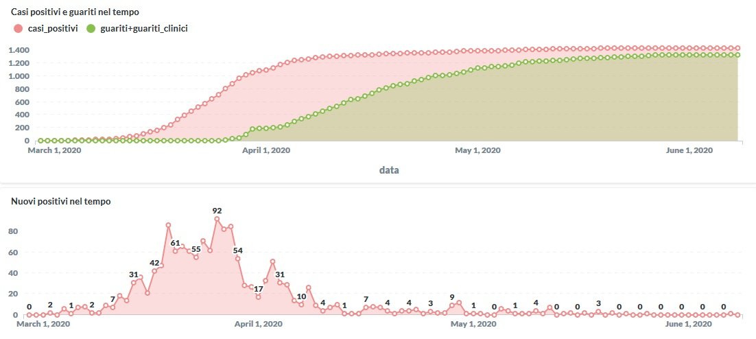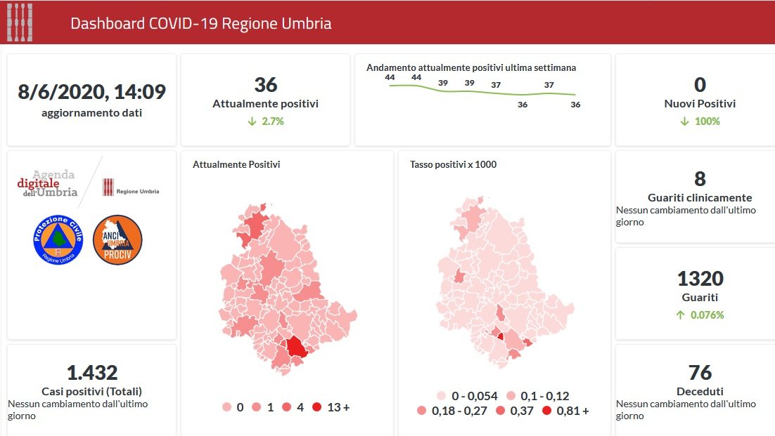 Tornano a zero i contagi in Umbria da Covid-19. Dai dati aggiornati alle ore 14:09 di oggi 8 giugno, 1432 persone in Umbria risultano positive al virus (+0 rispetto a ieri), gli attualmente positivi sono 36 (uguale rispetto a ieri), i guariti sono 1320 (uguale rispetto a ieri).