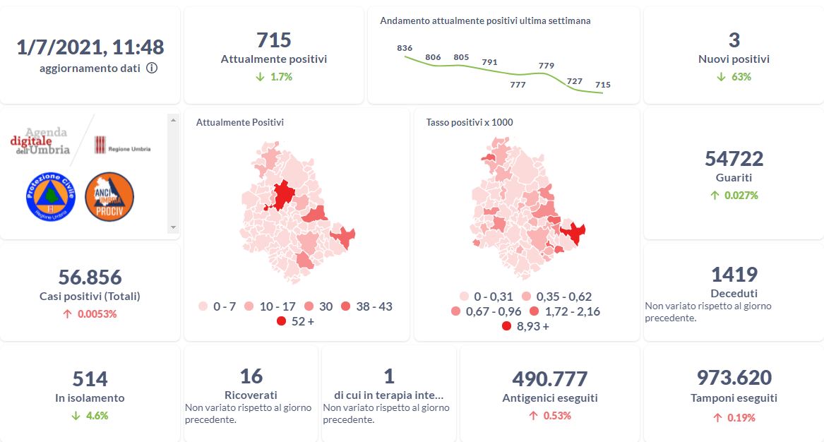 La curva degli attualmente positivi al Covid-19 in Umbria sta lentamente scendendo nelle ultime settimane. Dai dati aggiornati alle ore 11:48 di oggi 1° luglio, 56.856 persone in Umbria risultano in totale positive al virus (+3 rispetto a ieri) , gli attualmente positivi sono 715 (-12 rispetto a ieri), i guariti sono 54.722 (+15 rispetto a ieri).
