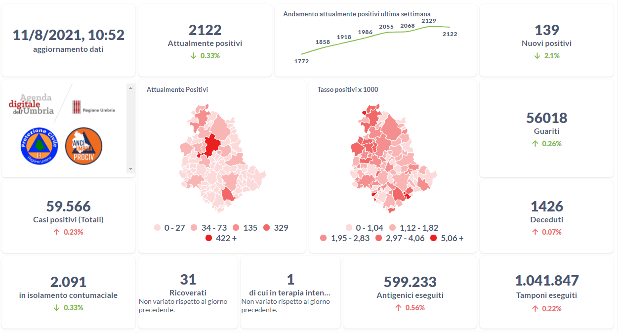Dai dati aggiornati alle ore 10:52 di oggi 11 agosto, 59.566 persone in Umbria risultano in totale positive al virus (+139 rispetto a ieri) , gli attualmente positivi sono 2.122 (-7 rispetto a ieri) , i guariti sono 56.018 (+145 rispetto a ieri).