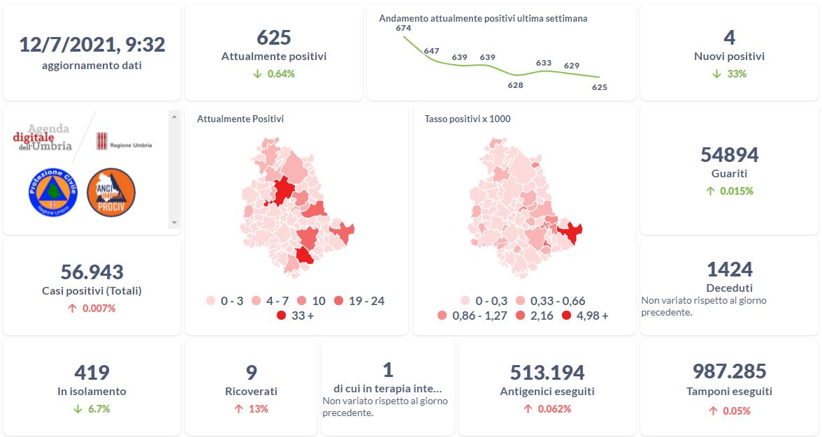 La curva degli attualmente positivi al Covid-19 in Umbria sta lentamente scendendo nelle ultime settimane. Dai dati aggiornati alle ore 09:32 di oggi 12 luglio, 56.943 persone in Umbria risultano in totale positive al virus (+4 rispetto a ieri) , gli attualmente positivi sono 625 (-4 rispetto a ieri), i guariti sono 54.894 (+8 rispetto a ieri).