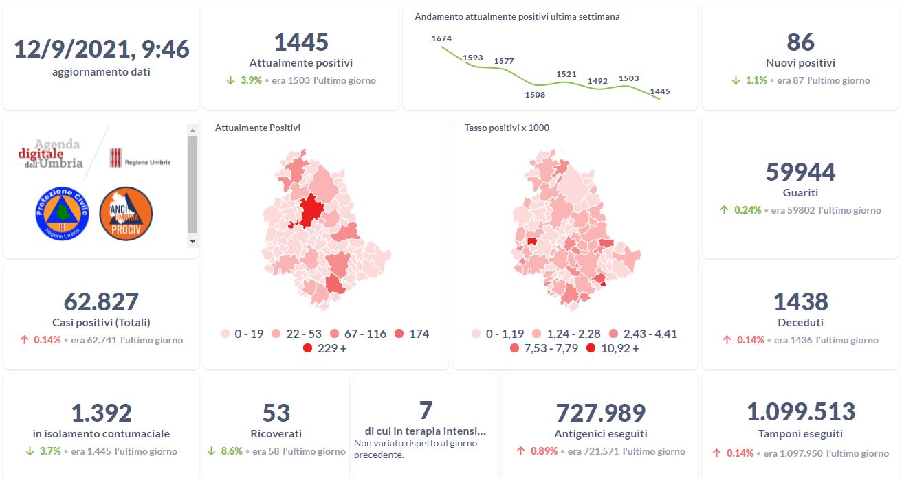 Dai dati aggiornati alle ore 09:46 di oggi 12 settembre, 62.827 persone in Umbria risultano in totale positive al virus (+86 rispetto a ieri), gli attualmente positivi sono 1.445 (-58 rispetto a ieri), i guariti sono 59.944 (+142 rispetto a ieri).