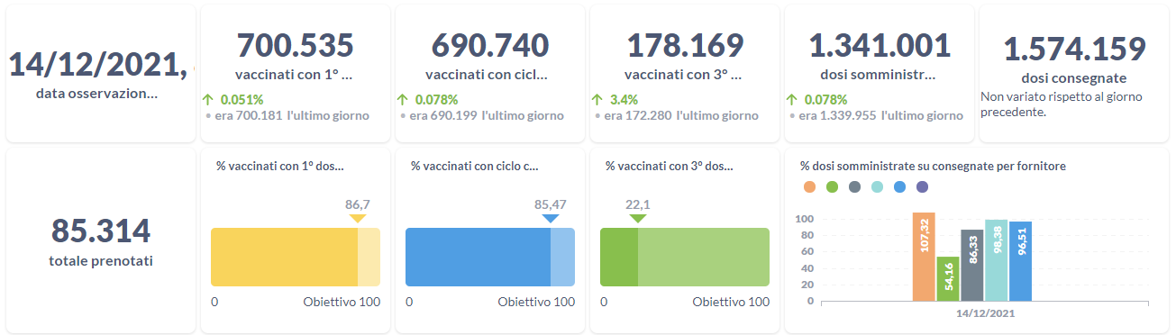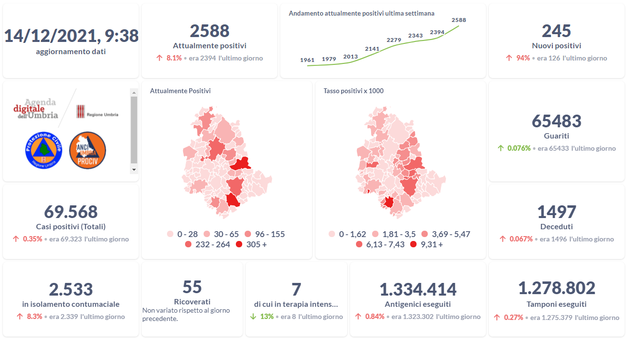 Dai dati aggiornati alle ore 09:38 di oggi 14 dicembre, 69.568 persone in Umbria risultano in totale positive al virus (+245 rispetto a ieri), gli attualmente positivi sono 2.588 (+194 rispetto a ieri), i guariti sono 65.483 (+50 rispetto a ieri).