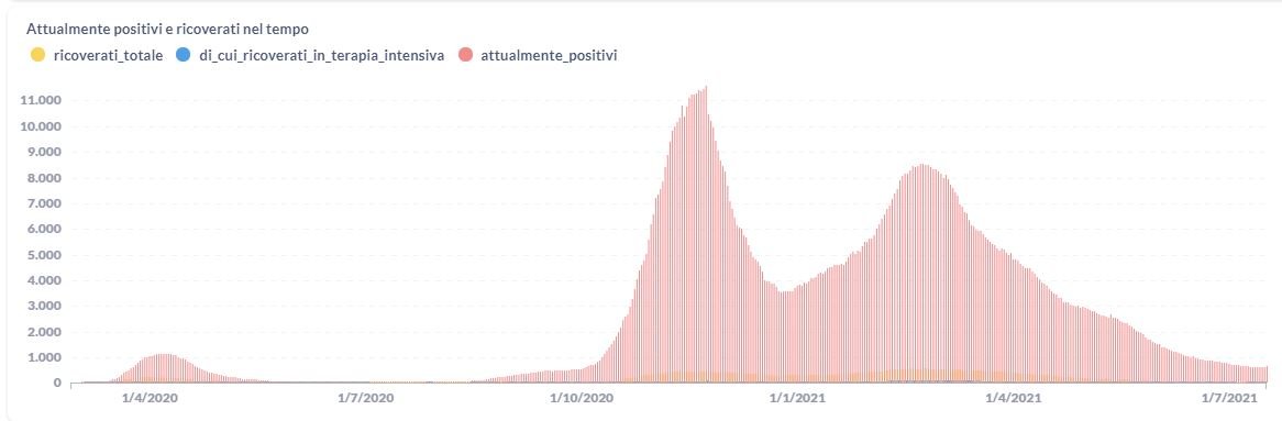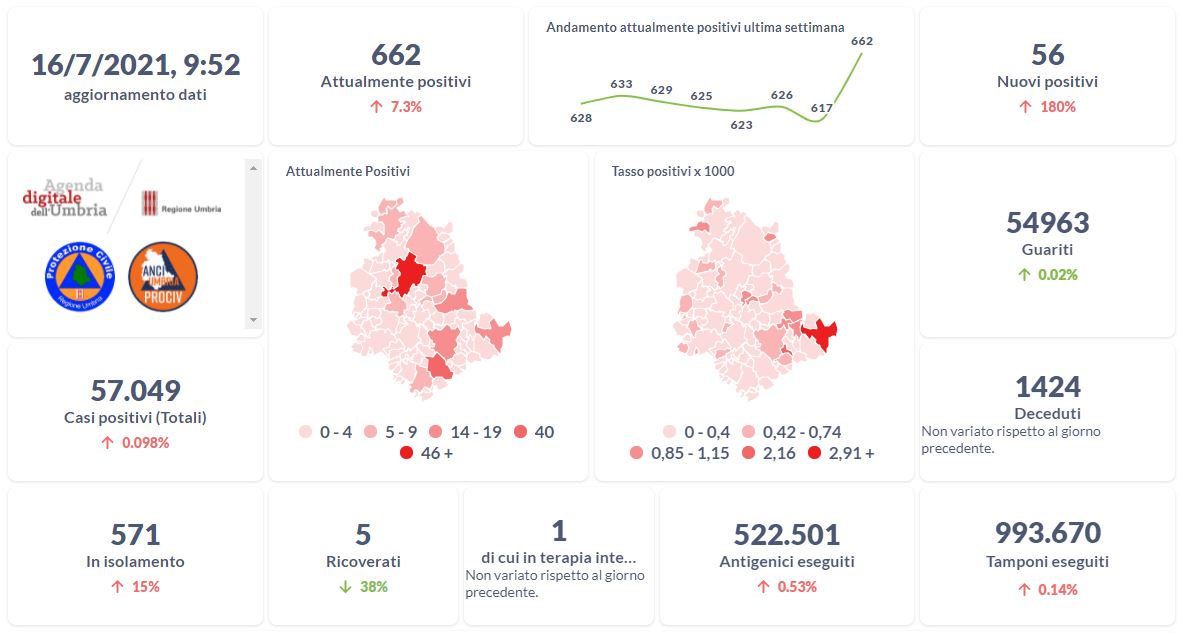 La curva degli attualmente positivi al Covid-19 in Umbria sta lentamente scendendo nelle ultime settimane. Dai dati aggiornati alle ore 09:52 di oggi 16 luglio, 57.049 persone in Umbria risultano in totale positive al virus (+56 rispetto a ieri) , gli attualmente positivi sono 662 (+45 rispetto a ieri), i guariti sono 54.963 (+11 rispetto a ieri).