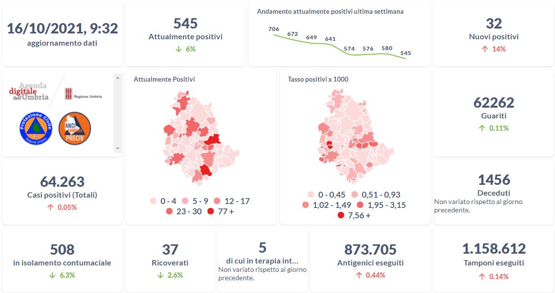 Dai dati aggiornati alle ore 09:32 di oggi 16 ottobre, 64.263 persone in Umbria risultano in totale positive al virus (+32 rispetto a ieri), gli attualmente positivi sono 545 (-35 rispetto a ieri), i guariti sono 62.262 (+67 rispetto a ieri).