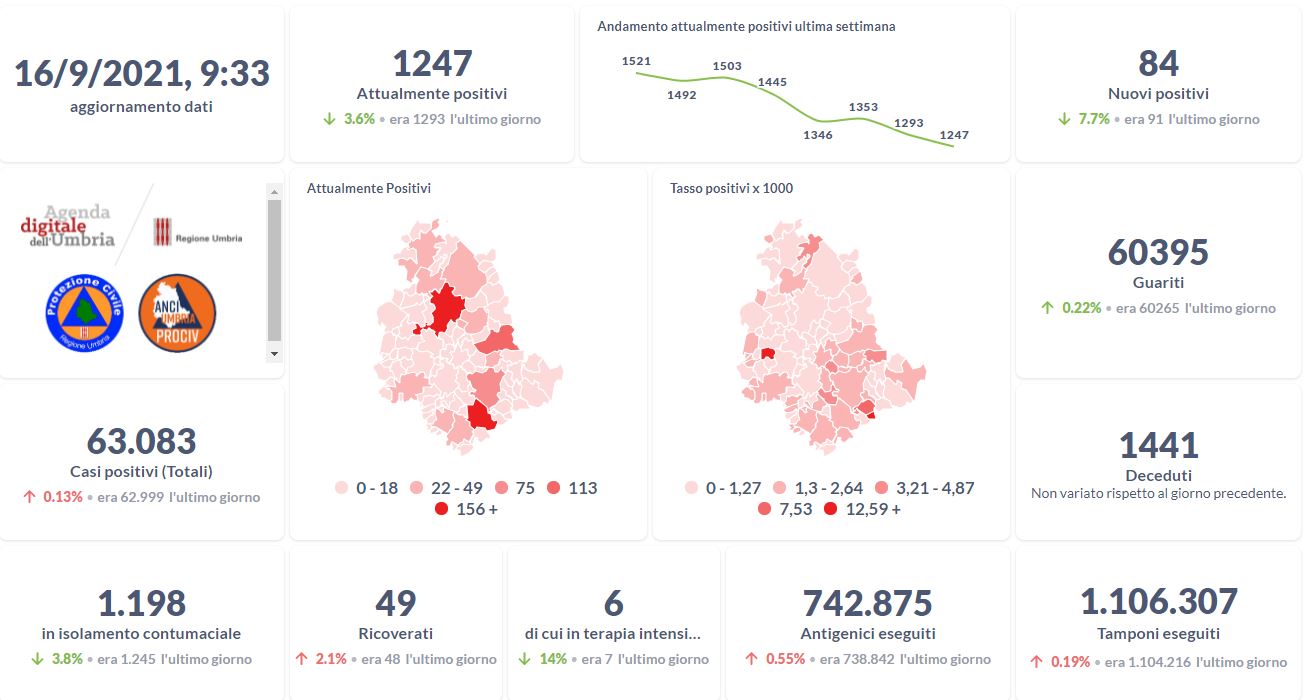 Dai dati aggiornati alle ore 09:33 di oggi 16 settembre, 63.083 persone in Umbria risultano in totale positive al virus (+84 rispetto a ieri), gli attualmente positivi sono 1.247 (-46rispetto a ieri), i guariti sono 60.395 (+130 rispetto a ieri).