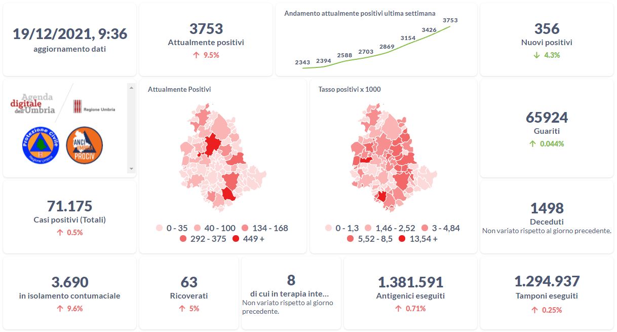 Dai dati aggiornati alle ore 09:36 di oggi 19 dicembre, 71.175 persone in Umbria risultano in totale positive al virus (+356 rispetto a ieri), gli attualmente positivi sono 3.753 (+327 rispetto a ieri), i guariti sono 65.924 (+29 rispetto a ieri).