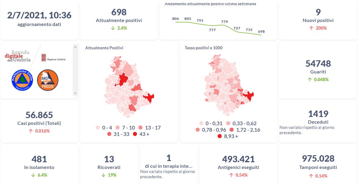 La curva degli attualmente positivi al Covid-19 in Umbria sta lentamente scendendo nelle ultime settimane. Dai dati aggiornati alle ore 10:36 di oggi 2 luglio, 56.865 persone in Umbria risultano in totale positive al virus (+9 rispetto a ieri) , gli attualmente positivi sono 698 (-17 rispetto a ieri), i guariti sono 54.748 (+26 rispetto a ieri).
