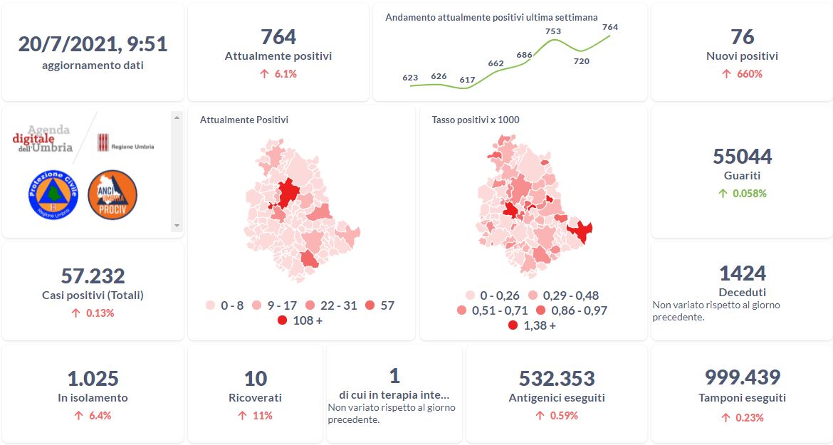 Dai dati aggiornati alle ore 09:51 di oggi 20 luglio, 57.232 persone in Umbria risultano in totale positive al virus (+76 rispetto a ieri) , gli attualmente positivi sono 764 (+44 rispetto a ieri), i guariti sono 55.044 (+32 rispetto a ieri).