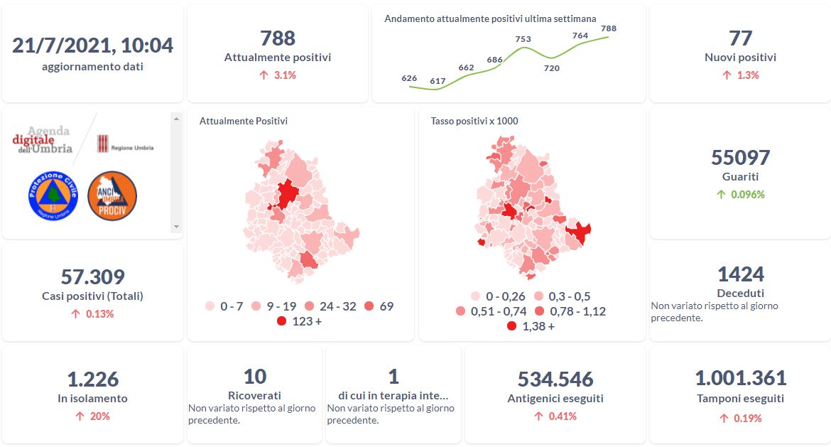 Dai dati aggiornati alle ore 10:04 di oggi 21 luglio, 57.309 persone in Umbria risultano in totale positive al virus (+77 rispetto a ieri) , gli attualmente positivi sono 788 (+24 rispetto a ieri), i guariti sono 55.093 (+53 rispetto a ieri).