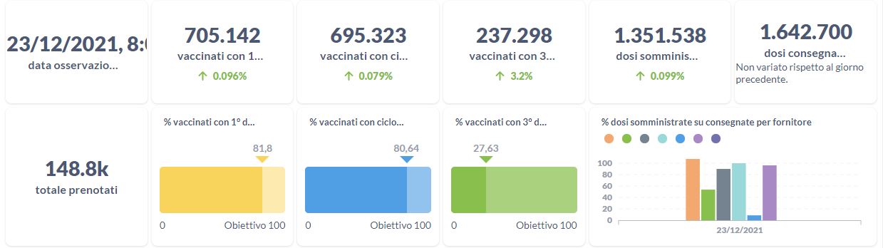 Dai dati aggiornati alle ore 09:55 di oggi 23 dicembre, 73.403 persone in Umbria risultano in totale positive al virus (+933 rispetto a ieri), gli attualmente positivi sono 5.374 (+803 rispetto a ieri), i guariti sono 66.530 (+130 rispetto a ieri).