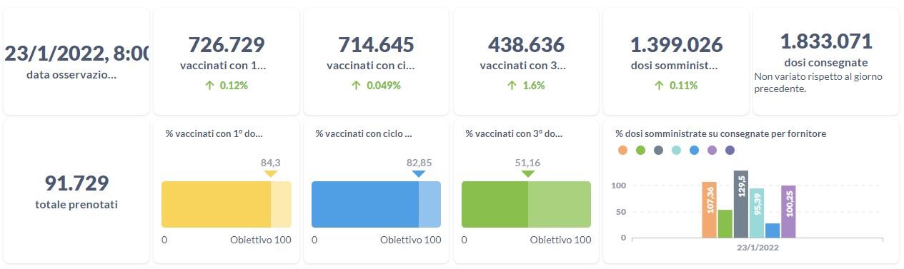Dai dati aggiornati alle ore 10:09 di oggi 23 gennaio, 141.927 persone in Umbria risultano in totale positive al virus (+1.832 rispetto a ieri), gli attualmente positivi sono 24.935 (-473 rispetto a ieri), i guariti sono 115.399 (+2.299 rispetto a ieri).
